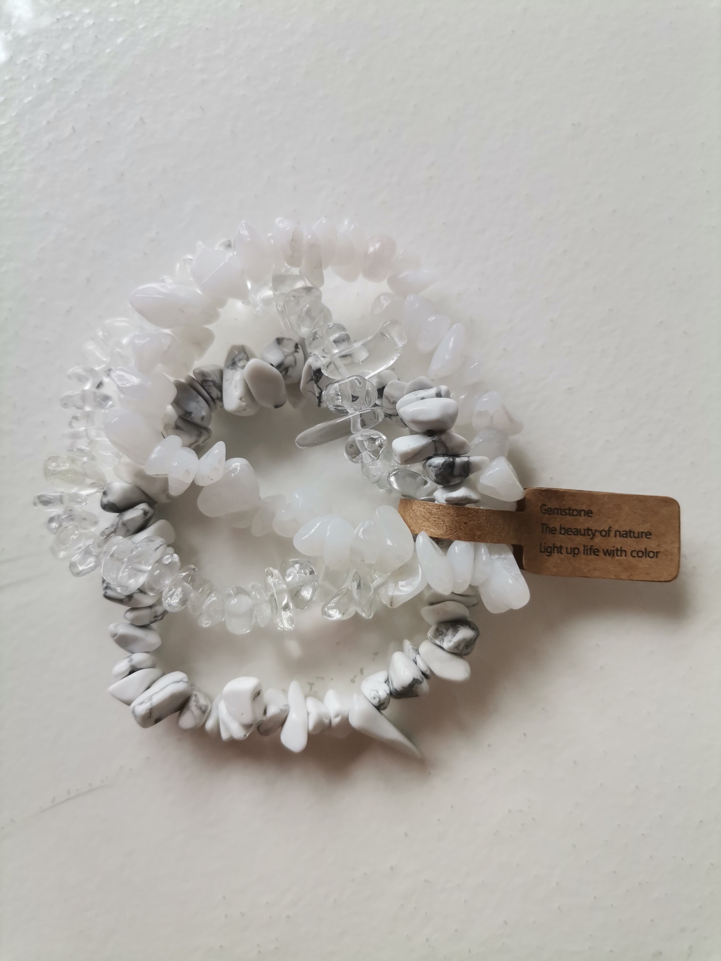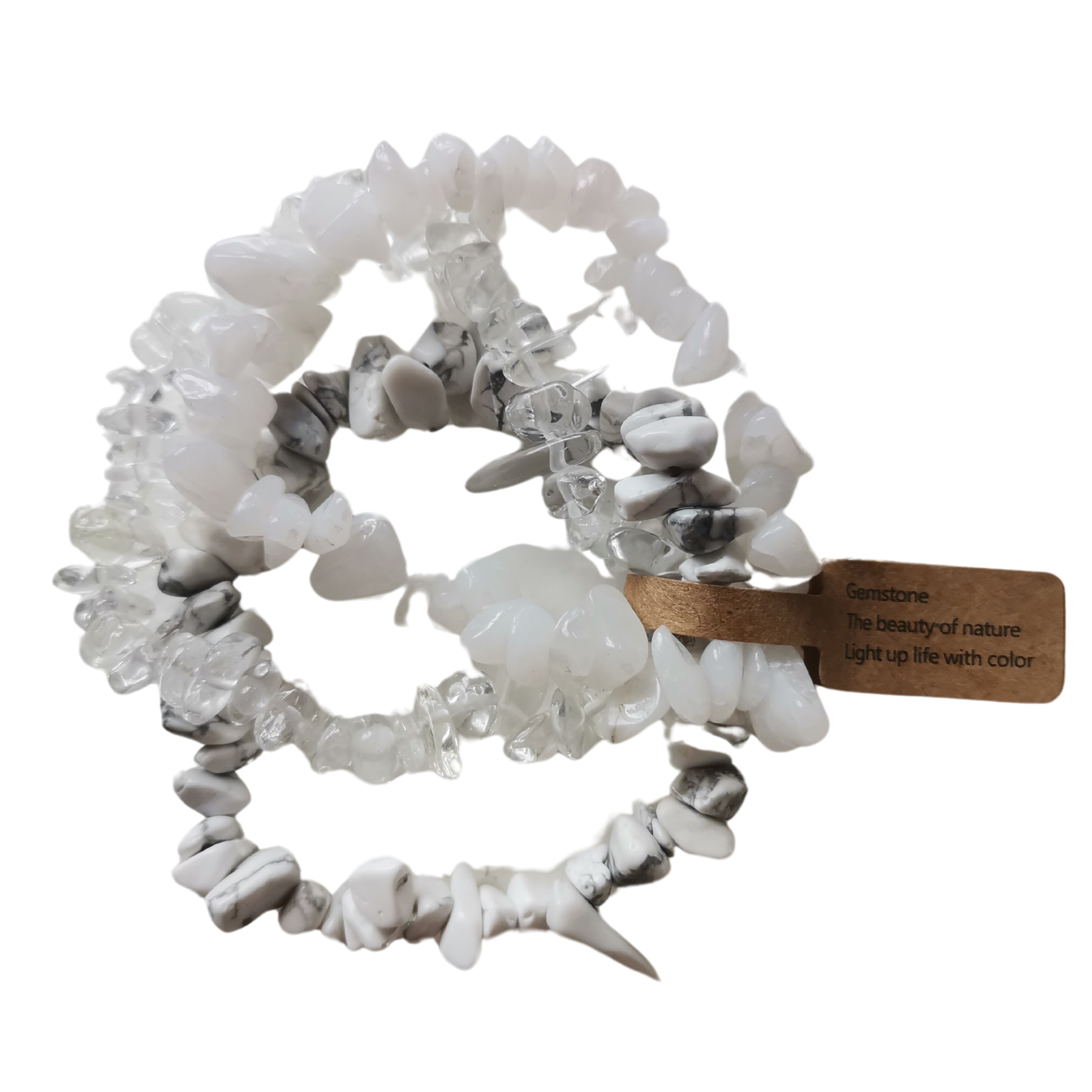 Howlita branca: emite altas vibrações calmantes capazes de melhorar pensamentos e sentimentos ruins, conseguindo equilibrar todas as energias do corpo. Conhecida como a pedra da harmonia, traz paz, proteção, confiança espiritual, fortalece a fé, reduz o ego excessivo, a capacidade de desfazer amarras energéticas e ajuda a remover e impedir energias negativas.