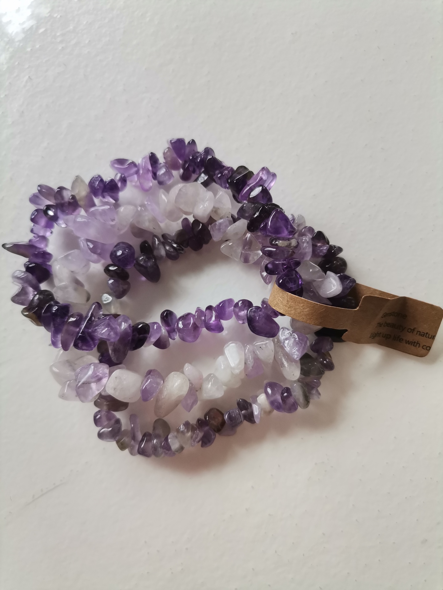 Pulseira elástica de pedras naturais roxas e brancas com etiqueta de papel castanho